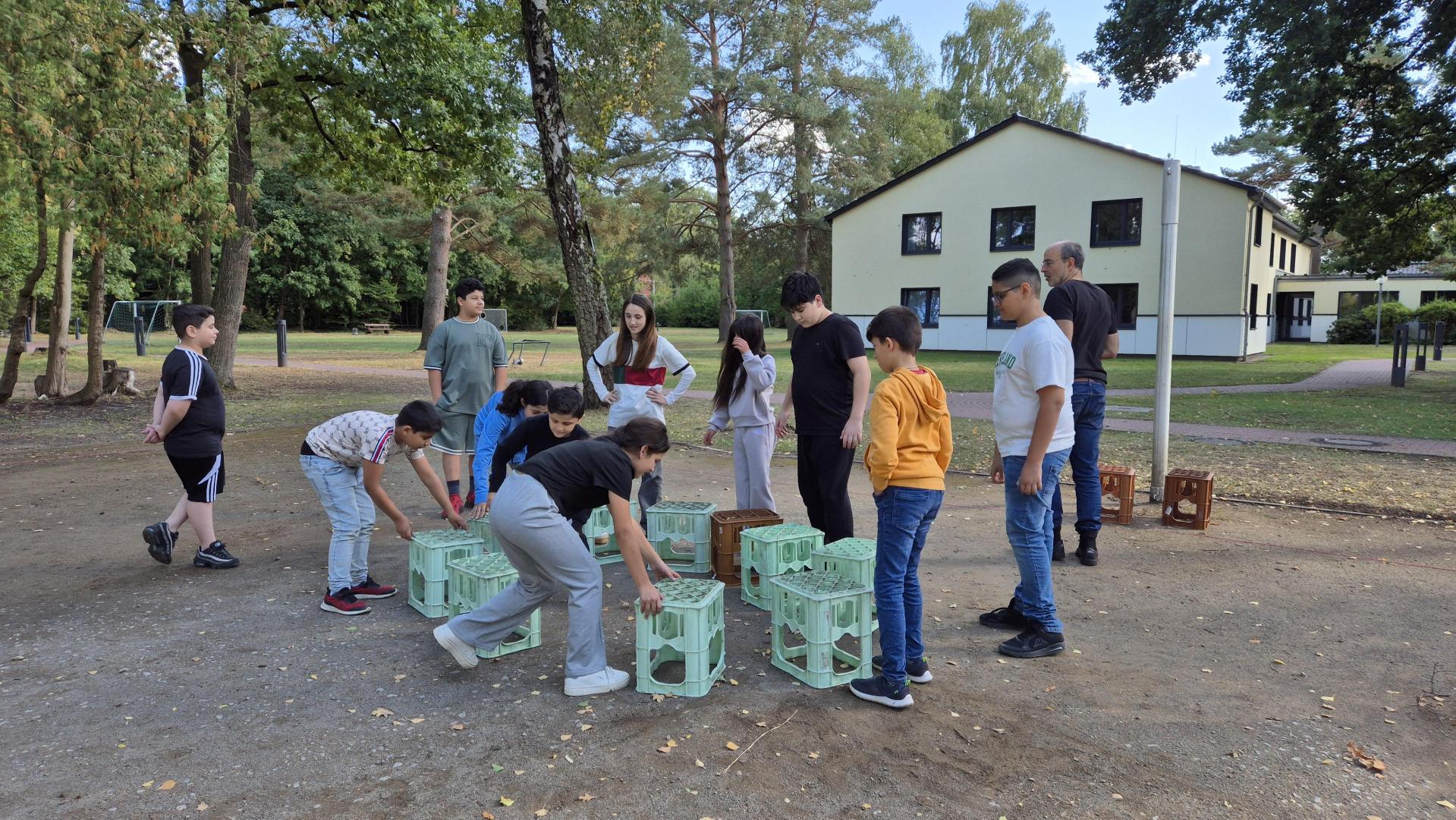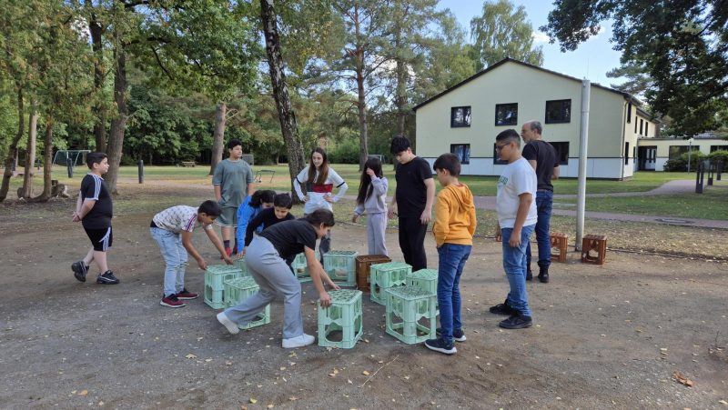 Nach dem Mittagessen und einer kurzen Pause ging es mit Vertrauensübungen weiter. Dabei lernten die Fünftklässler, ihren neuen Mitschülerinnen und Mitschülern blind zu vertrauen – und das wörtlich: Ein Partner wurde blind über das Gelände geführt.