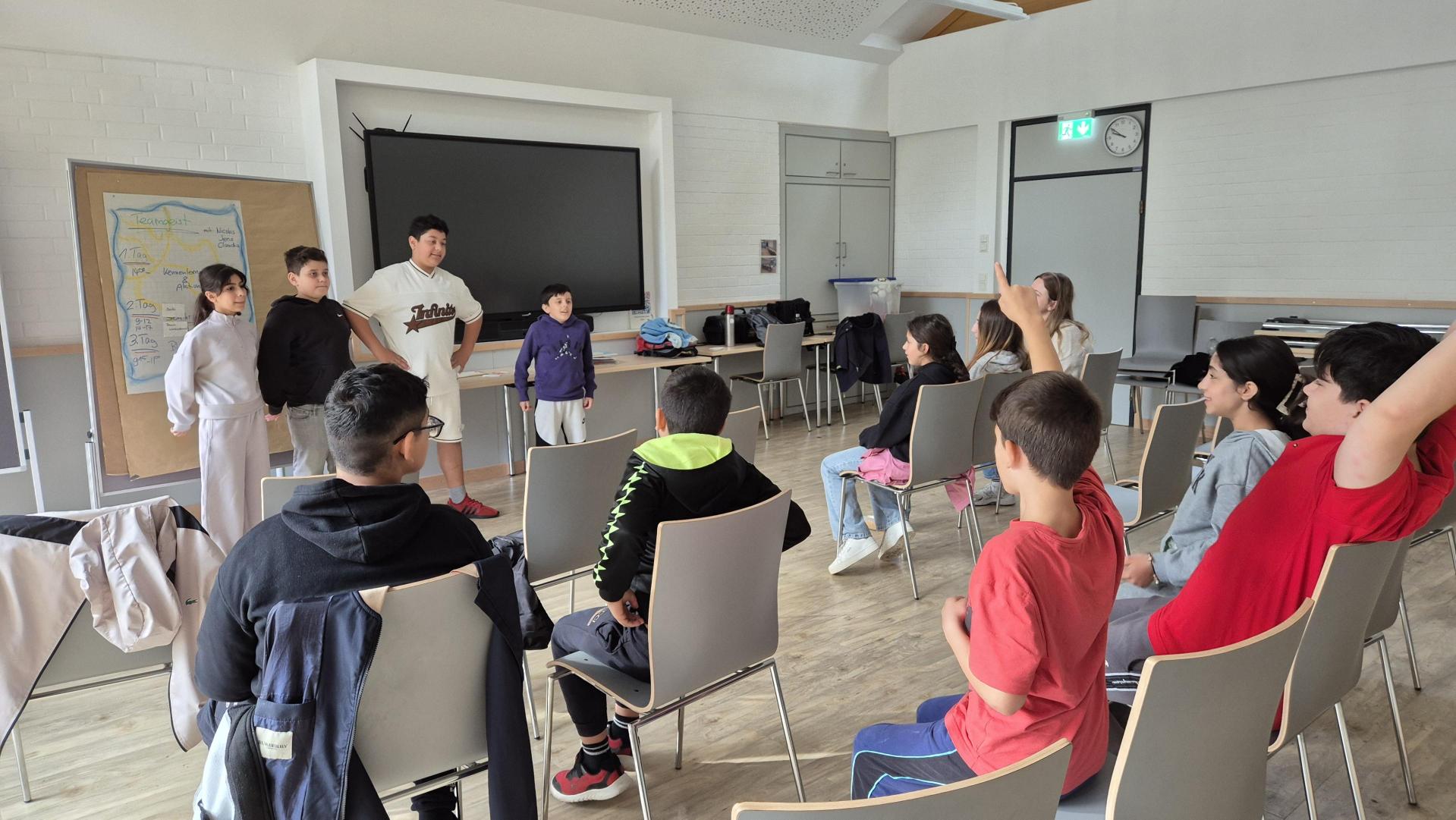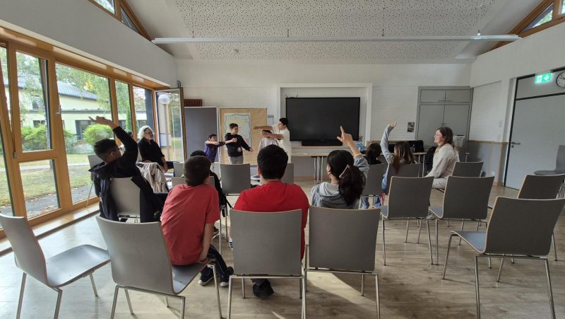 Der Mittwoch begann mit einem Rückblick auf die vergangenen Tage. Alle auf der Klassenfahrt durchgeführten Spiele wurden in Kleingruppen pantomimisch nachgestellt und von den Mitschülerinnen und Mitschülern erkannt.